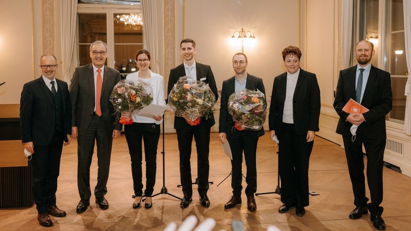 Les lauréats Beatrix Eugster, Simone Balestra et Helge Liebert, photographiés aux côtés de Guy Parmelin, président de la Confédération et Silvia Steiner, présidente de la CDIP, ainsi que Stefan Kölliker, président du conseil de l'Université de Saint-Gall (à gauche) et Ludger Woessmann (à droite)